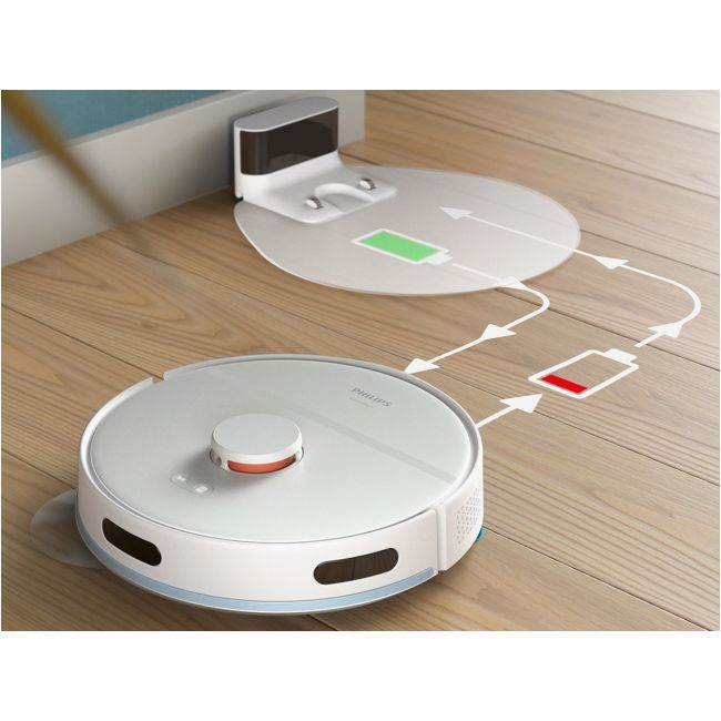 Dzięki czasowi pracy do 130 minut, wystarczającemu na powierzchnię do 120 m², możesz wykonać pełne sprzątanie na jednym ładowaniu akumulatora. Gdy bateria jest już prawie wyczerpana, robot automatycznie ją ładuje. Po naładowaniu akumulatora powróci on do miejsca, w którym przerwano czyszczenie, i wznowi go.