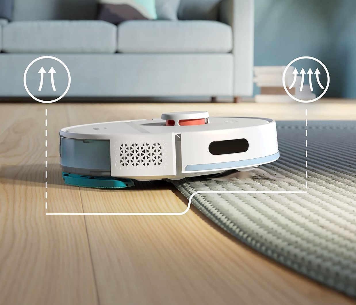 Robot automatycznie zwiększa moc ssania, gdy znajduje się na dywanie, aby zebrać drobne cząsteczki kurzu ukryte głęboko w dywanie.