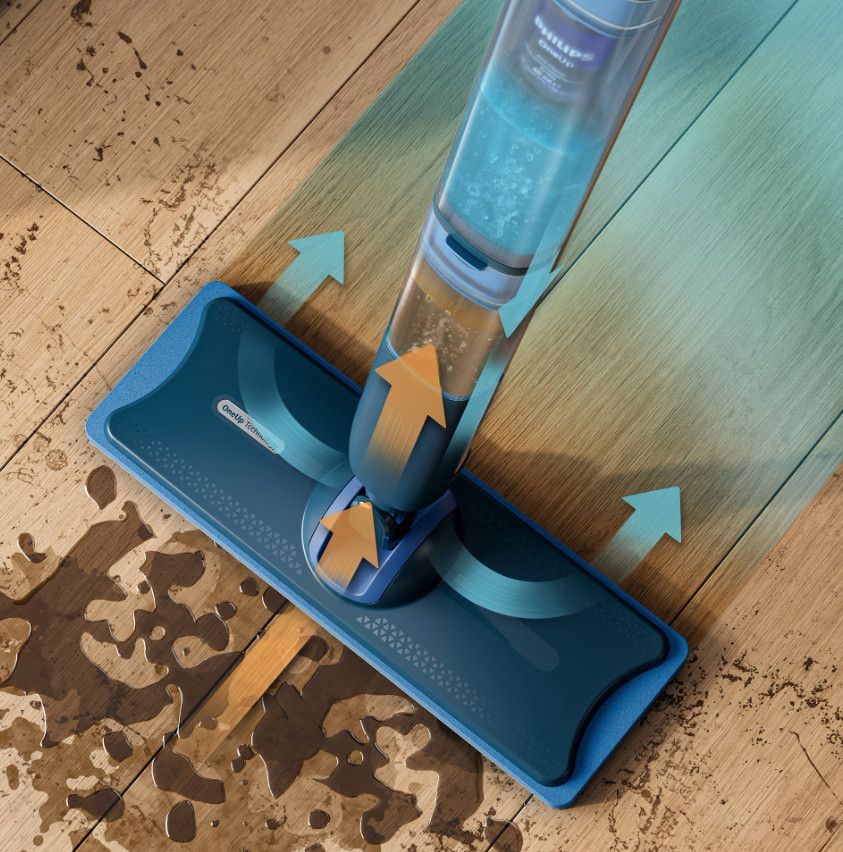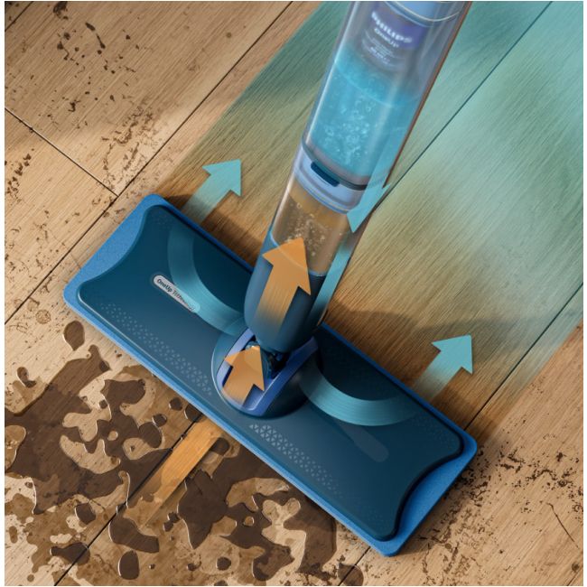 Pożegnaj się z tradycyjnymi mopami, które rozmazują brud! Mop elektryczny Philips OneUp zapewnia 2 razy czystsze podłogi i to 2 razy szybciej. Zasysa brudną wodę, jednocześnie dystrybuując czystą wodę na podłogę, by uzyskać nieskazitelny połysk